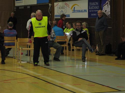 Odotimme jo kovasti pääsyä kunnostetulle ulkokentällemme pelaamaan, mutta kun ulkolämpötila lähenteli nollaa ja vettä/räntää tulii taivaalta, olimme pakotettuja pelaamaan vielä sisällä tämän kerran. Jopa Eero kieltäytyi kohteliaasti ulkokentällä pelaamisesta (eihän siellä tarkene pirukaan!). Parin viikon päästä pelattavia henkilökohtaisia kisoja ajatellen olisi ulkopelin harjoittelu kyllä tarpeen, sillä ulkopeli kovilla muovipalloilla on ihan eri peli kuin sisäpeli pehmeillä nahkapalloilla. Jospa viikon päästä se onnistuisi! Päätimme ilmoittaa henkilökohtaisiin piirinmestaruuskisoihin seuraavat pelaajat: Irma, Matti B ja Leena, Matti A, Irena, Inkku, Veikko ja Jorma.