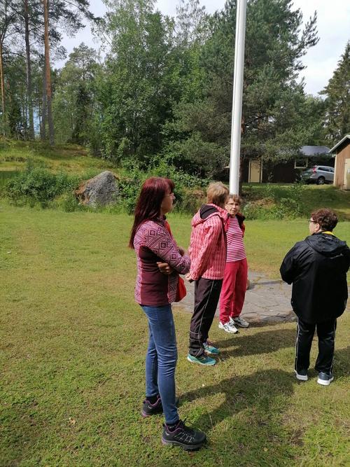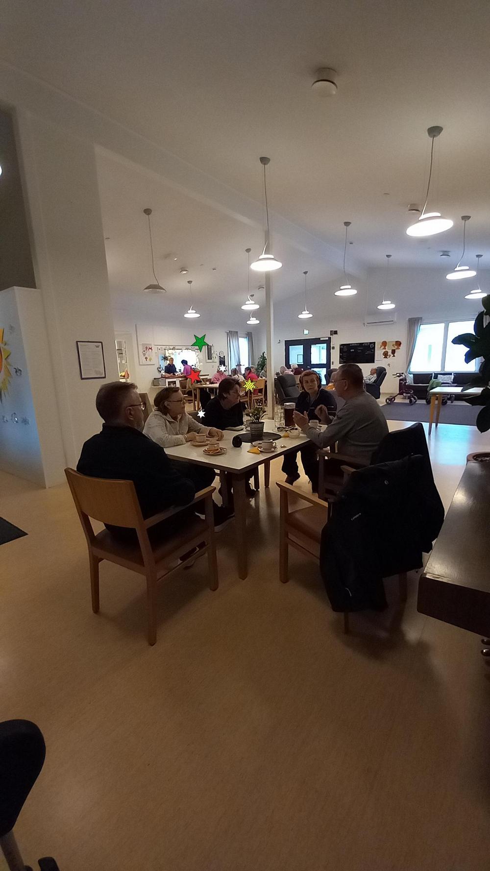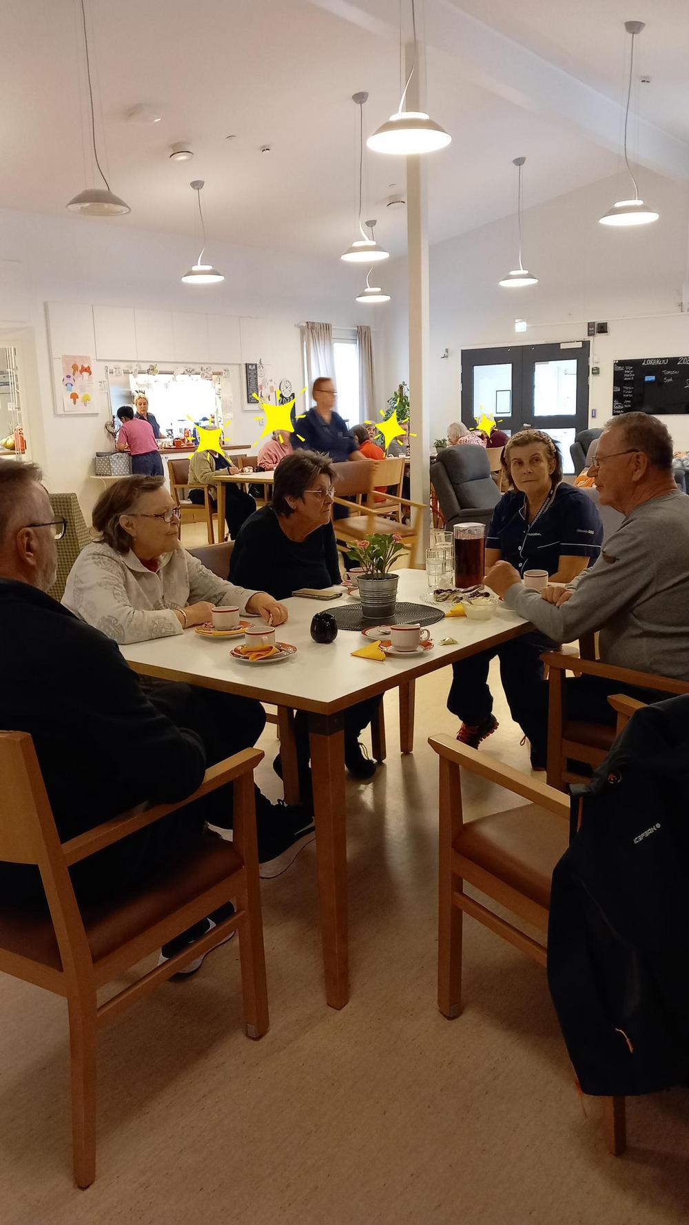 5.10 oli vuorossa Onnentäyttymys ja siellä oli asukkaita ulkoiluttamassa Tuija, Jorma, Irma, Eero ja Kikka